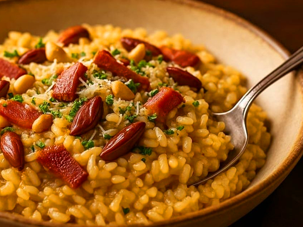 O Arroz à Grega da Rotisserie Espaço Gourmet, em Alphaville, é preparado com arroz soltinho, legumes selecionados e tempero equilibrado, resultando em uma guarnição leve, colorida e cheia de sabor. É o acompanhamento ideal para carnes assadas, trazendo frescor e harmonia ao prato.